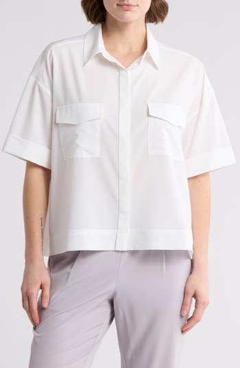 Perfect to layer or wear solo, this slouchy button-up shirt is fashioned with utility-inspired pockets for laid-back appeal.