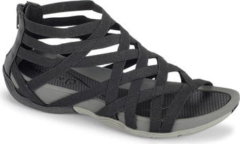 Multiple straps in a swooping asymmetric design top this breezy sandal furnished with a well-cushioned footbed for all-day comfort.