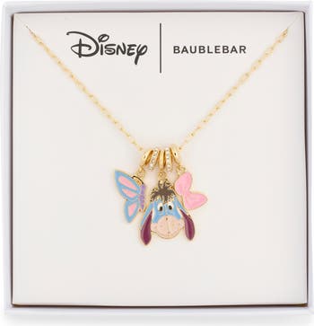 A smiling Eeyore and playful spring charms ground a dainty chain necklace that's rendered from goldtone plate.