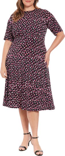 An abstract print brightens a charming fit-and-flare midi dress fashioned with elbow-length sleeves and an inset waist.