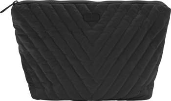 Keep your makeup and brushes organized during your next weekend getaway with this chic cosmetic pouch featuring plush channel quilting.