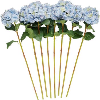 A delicate cluster of pastel petals forms these timelessly beautiful faux hydrangea blossoms. This set of eight stems, each with an elegant length, brings a touch of brightness to your favorite vase and room.