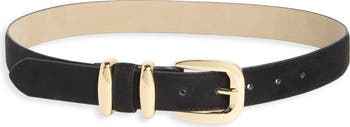 Supple faux-suede construction enhances the look of an everyday belt defined by a brightly-polished buckle and keepers.