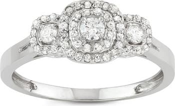 A trio of halo-set round-cut diamonds centers this simple yet stunning 51-diamond ring made from 10-karat white gold.