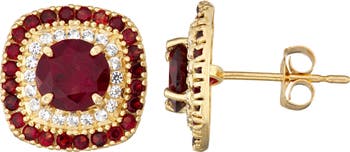 Lab-grown white sapphires surround round-shaped garnets on these studs crafted in 10-karat yellow gold.