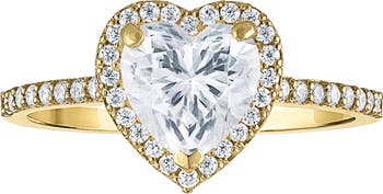 Show off romantic sparkle with this lab-grown moissanite heart halo ring crafted from warm 10-karat yellow gold.