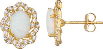 Bring iridescent sparkle to your lobes with these stud earrings crafted in warm 10-karat gold and set with with lab-grown opals framed in lab-grown white sapphires.