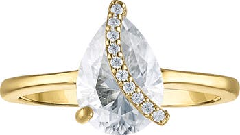 A sparkly ribbon-like swirl accents a pear-cut lab-grown moissanite on this elegant solitaire ring crafted from warm 10-karat gold.