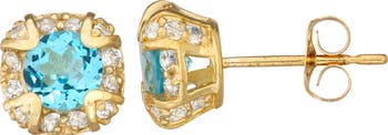 Elevate your daytime or evening ensembles with these warm 10-karat gold studs boasting round-cut faceted-stone centers framed in lab-grown white sapphires.