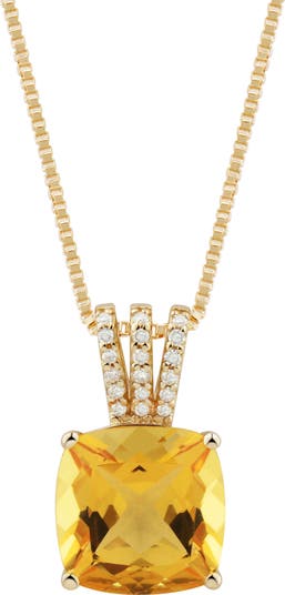 Pavé diamonds enrich this glamorous cushion-cut citrine pendant necklace crafted from warm 10-karat yellow gold.