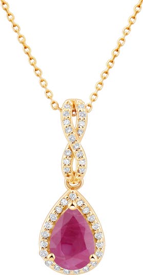 Sparkly round diamonds frame a pear-cut ruby on this elegant pendant necklace crafted from warm 10-karat yellow gold.
