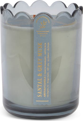 This candle features elegant scalloped glass, a cotton wick and a warm santal and grey musk scent that softly fills the room.