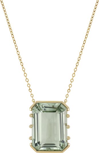 A half prong- and half bezel-set green amethyst stone adds instant glamour to this statement-making pendant necklace crafted from gleaming 14-karat gold.