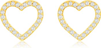 Dainty diamonds trace romantic open-heart stud earrings crafted from 14-karat gold for elegant shine.