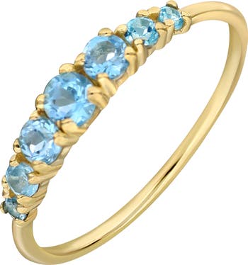 Vibrant peridot or blue topaz stones sparkle along the top of this dainty ring handcrafted in Spain from 14-karat gold.