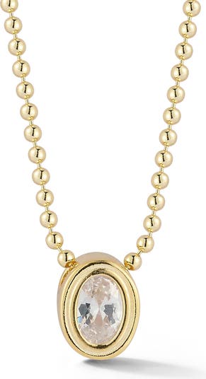 This sterling silver necklace plated in 14-karat gold features a ball-chain strand centered by a bezel-set cubic zirconia pendant.
