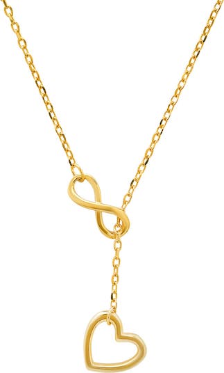 Infinity and heart charms grace the ends of this lariat necklace plated in gleaming 14-karat gold.