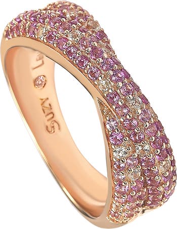 Pavé set pink sapphires and lab-grown white sapphires gives a glittering finish on this elegant rose sterling silver crossover ring.