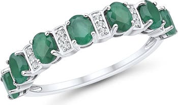 Oval-cut emeralds and stacked round diamonds illuminate an elegant ring crafted from polished 14-karat white gold.