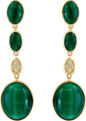 Add the perfect finishing touch to your ensemble with these 14K yellow gold drop earrings featuring emerald-hued malachite and sparkling diamonds.