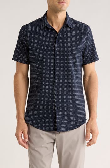 Look sharp and stay comfortable in this short-sleeve button-up shirt cut from crisp performance fabric with a geometric pattern.