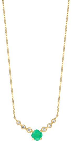 Dazzling diamonds flank a cushion-cut emerald that trims the elegant necklace fashioned from fine 18K gold.