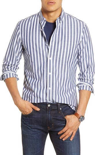 Crisp cotton oxford cloth furthers the classic appeal of a sport shirt styled with a trim fit emphasized by bold vertical stripes.