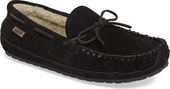 A plush faux-shearling liner means warmth and comfort in a moc-stitched slipper grounded by a flexible rubber sole.