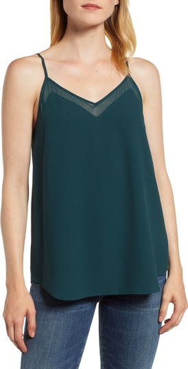 Slinky, shoulder-flaunting and perfect for date night, this flattering crepe tank features an alluring, sheer chiffon inset at the V-neckline.
