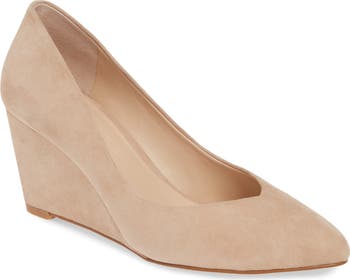 A tonal wedge enhances the leg-lengthening lift of a day-to-night pump with a gently rounded almond toe.