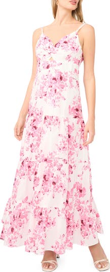 Perfect for your next weekend event, this flowy tiered maxi features an allover floral print, knotted straps and a twisted bodice.
