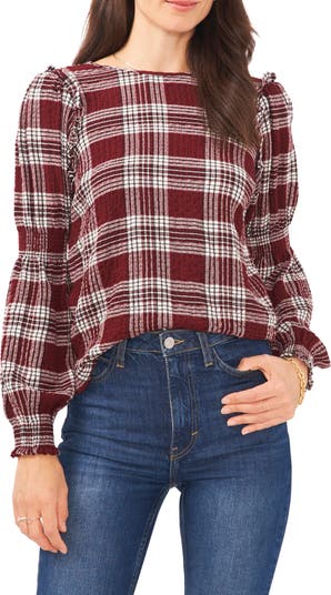 Balloon sleeves and an elegant bateau neckline update a timeless top patterned in classic plaid.