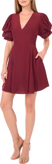 Two-tiered puff sleeves elegantly frame this satiny dress finished with a V-neck and arrow-shaped empire‑seam panel for a subtle statement.