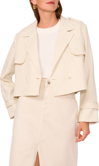 Trench coat styling adds interest to a cropped jacket striped in muted tones.