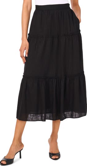 A gauzy texture gives a dimensional play on this tiered maxi skirt cut with a kiss of linen for a breezy fit even as the temp rises.