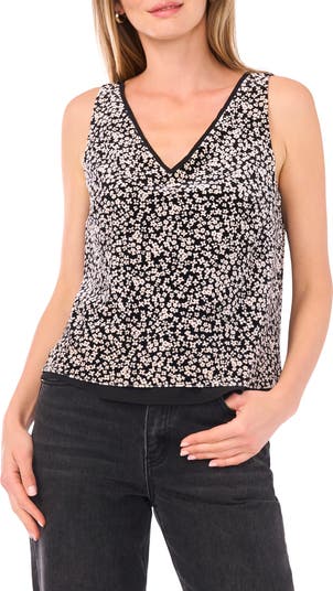 Refresh your desk-to-dinner selection by adding this woven shell to the mix, featuring a V front and back and a ditsy floral print.