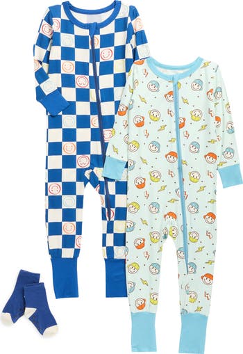 Keep your little one cozy in this three-piece pajama set including two zip-front coveralls made from soft, breathable jersey and coordinating grippy socks.