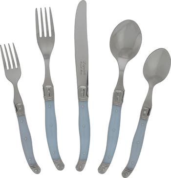 - - 20-piece set - Fully tanged durable stainless steel - Decorated with the iconic Laguiole Bee - The bee is situated very close for comfort and aesthetics - Serrated blade stays sharp - Color: blue - Imported Set includes: - (4) 9.25" dinner knives - (4) 8.5" dinner forks - (4) 8.25" soup spoons - (4) 7.25" salad forks - (4) 7.25" dessert spoons