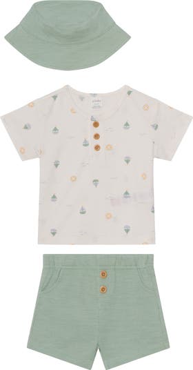 Your best first mate will be ready for warmer weather in this soft knit set featuring a short-sleeve henley shirt, pull-on shorts and a soft bucket hat for shady sun protection.