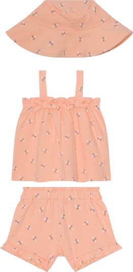 Buzzing with charm, this three‑piece fashion knit short set is sweet as can be. A matching hat completes a darling summer look that is light, soft, and full of joy.