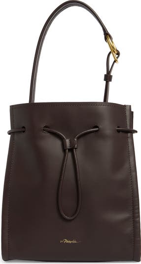 Carry your essentials in this smooth leather tote bag framed by a shoulder strap and cinching drawstring closure.