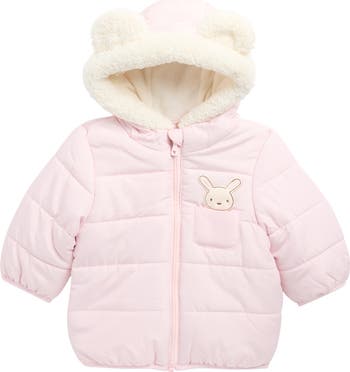An animal-themed hood and darling appliqué instantly sweeten a channel-quilted puffer jacket designed to keep baby warm and cozy on cooler days.