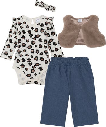 Little ones will love the cozy cool-kid feel of this set that includes a faux fur vest, pull-on pants, a knit bodysuit and matching headband.