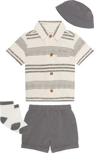 Outfit your baby in this stretch-enhanced cotton four-piece set featuring a striped button-up, shorts, socks and a hat for a cool, coordinated look.
