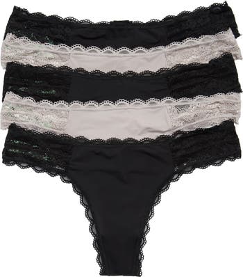 Elevate your basics with this perfect pack of five assorted thongs that are cut from soft microfiber and timmed with slinky lace.