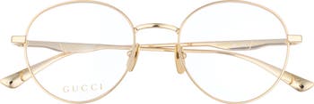 An engraved logo along the temples subtly style to round optical frames made from polished metal frames and fitted with prescription-ready lenses.