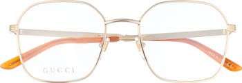 An engraved logo along the temples subtly style to round optical frames made from polished metal frames and fitted with prescription-ready lenses.