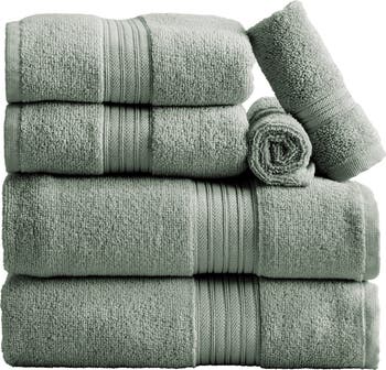[This review was collected as part of a promotion.] Super soft six piece set-two bath towels, two hand towels and two washcloths. Soft gray color with decorative band. Washes very nicely and dries without shedding the towel pieces all over. I’m pleasantly surprised with the quality of these. Highly recommend!