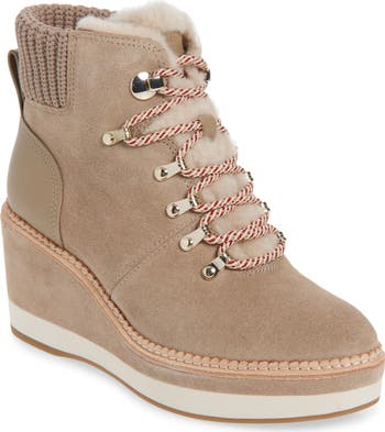 Supple suede defines a hiking-inspired bootie featuring a knit collar and wedge heel that provide both style and functionality while you're out and about.