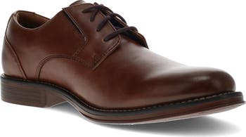 Some faux leather derby shoes with a lace-up closure offers a timeless, versatile appearance for any ensemble.